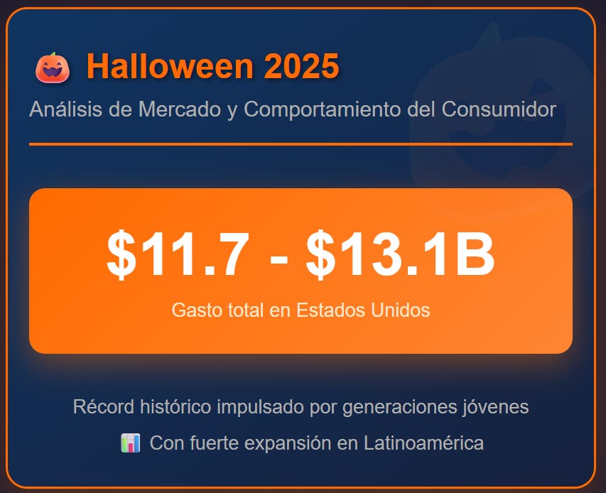 Halloween 2025 ha marcado un récord en gasto de consumo, especialmente en Estados Unidos y con fuerte proyección en mercados de Latinoamérica. Este año, el gasto total rondó entre 11.7 y 13.1 mil millones de dólares, impulsado principalmente por los jóvenes: Gen Z (18-28 años) y millennials (29-44 años).